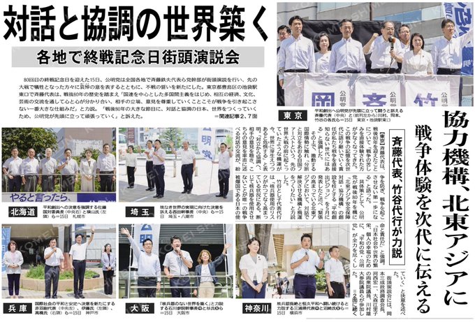 終戦80年の節目に全国で街頭演説北海道から沖縄まで全国各地で街頭演説を実施。対話と協調で平和を戦争体験を次世代へ北東アジア対話機構の創設核兵器廃絶へ「唯一の戦争被爆国として、核兵器を使わせないことが日..