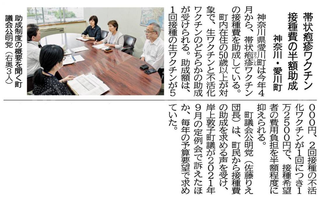 帯状疱疹ワクチン接種費の半額助成/神奈川・愛川町#公明新聞電子版2024年07月03日付https://komei.or.jp/newspaper-app/