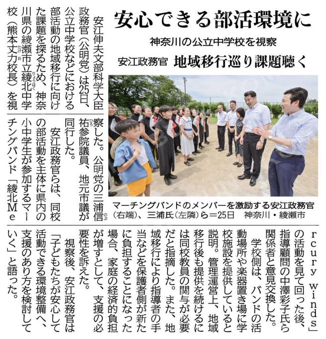 安心できる部活環境に/安江政務官、地域移行巡り課題聴く/神奈川の公立中学校を視察 #公明新聞電子版 2024年07月26日付 https://komei.or.jp/newspaper-app/