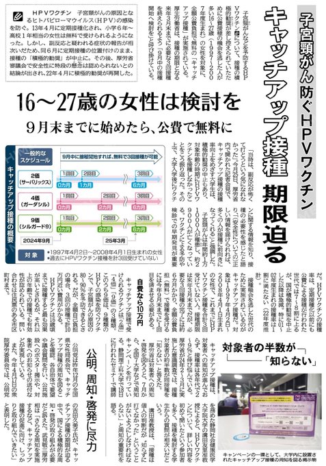 (子宮頸がん防ぐHPVワクチン)キャッチアップ接種の期限迫る/16~27歳の女性は検討を/9月末までに始めたら、公費で無料に#公明新聞電子版2024年07月31日付https://komei.or.j..