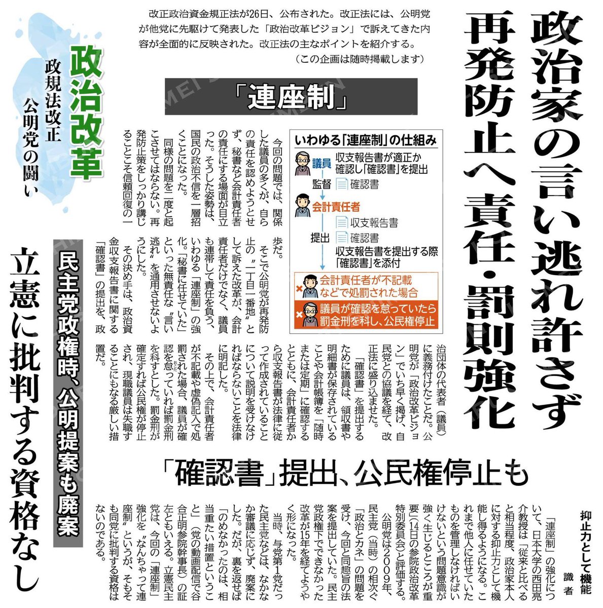 (政治改革政規法改正、公明党の闘い)「連座制」/政治家の言い逃れ許さず。再発防止へ責任・罰則強化/「確認書」提出、公民権停止も#公明新聞電子版2024年06月27日付https://komei.or...