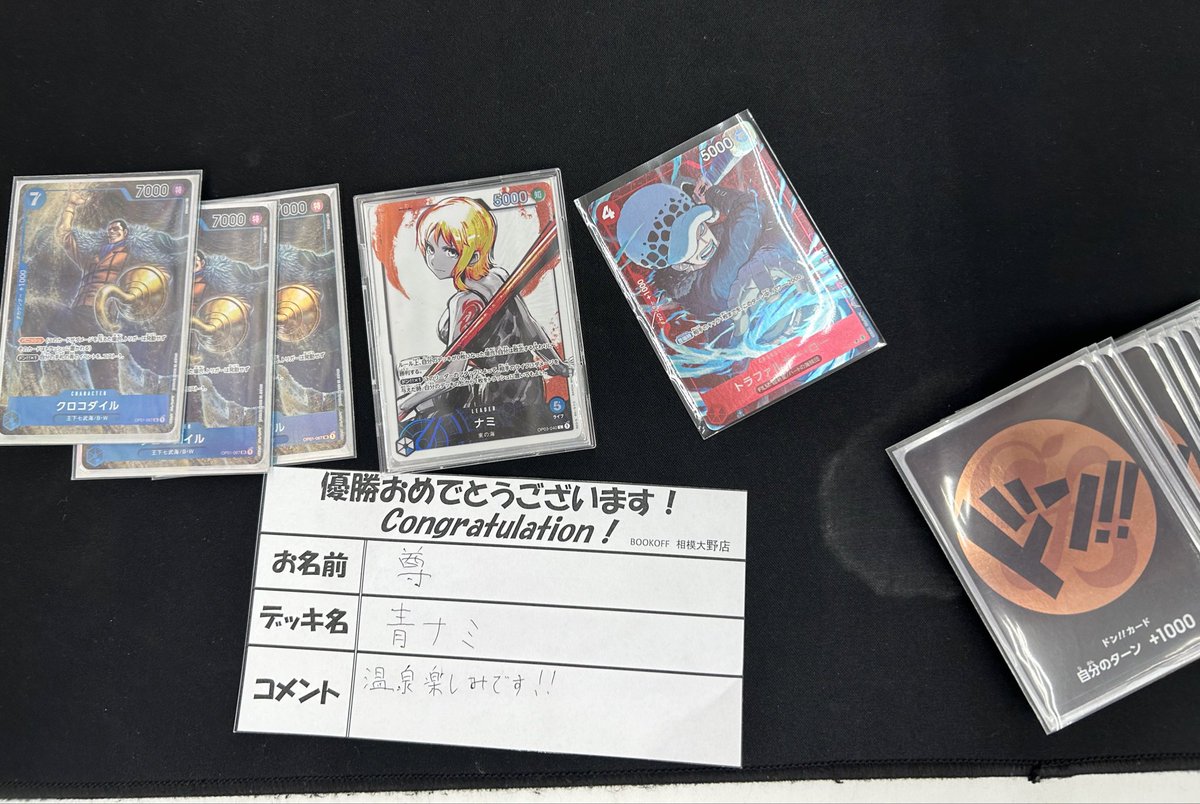 本日開催ワンピースカードゲームスタンダードバトル優勝は🎉尊選手❗️🎉デッキ名 《青ナミ》コメント 温泉楽しみです!!優勝おめでとうございます👍次回も皆様のご参加お待ちしてます✨001