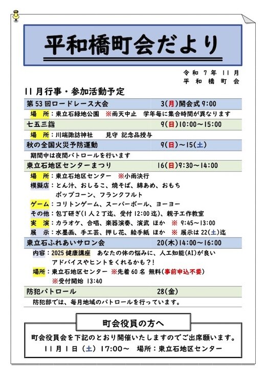 令和7年11月 平和橋町会だより 11月行事・参加活動予定 第53回ロードレース大会3(月・祝) 開会式9:00場所:東立石緑地公園 ※雨天中止 学年毎に集合時間が異なります 七五三詣9(日) 1