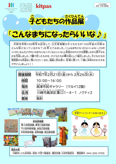 こどもたちが描く未来未来のかわさきをデザイン『こんなまちになったらいいな♪』作品展開催子どもたちの想いを感じにぜひ#高津市民ギャラリーへ2月21日~2月26日10:00~16:00#キットパスを使用し..