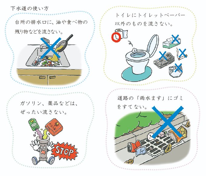 【下水道は正しく使いましょう】下水道に何でも流していませんか台所に油や食べ残しを流したり、トイレにトイレットペーパー以外のものを流したりすると、下水道管を詰まらせてしまいます生活環境を守るためにも、下..