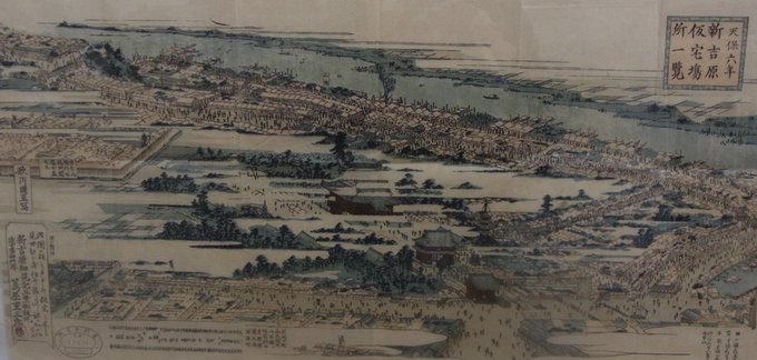 #地名資料室所蔵の絵図の中に「新吉原仮宅場所一覧」を見つけました。作者は歌川國直(江戸後期の浮世絵師)、版元は#蔦屋重三郎。もしや今年の大河ドラマの蔦屋重三郎か?残念、天保6年の新吉原案内絵図ですから..