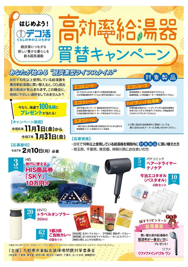 【省エネ家電等への買い替えでCO2排出量削減】九都県市で省エネ家電買替キャンペーン高効率給湯器買替キャンペーンを実施中!↓詳細はこちらを確認(1/31〆)↓https://tokenshi-kanky..