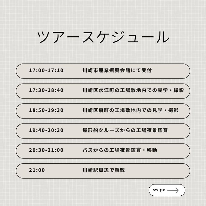 #市制100周年記念ツアー川崎工場夜景ツアー15周年記念の特別ツアー1月30日㈭17:00~21:00集合場所:川崎市産業振興会館前1月8日㈬10:00申込開始①必見2つの工場に特別潜入②屋形船運河ク..