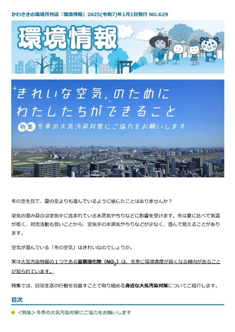 #環境情報629号を発行します!今月は冬の大気について特集します。きれいな空気を守るために、ぜひ一緒に考えてみてください。そのほか、イベントやお役立ち情報など、盛りだくさんの情報もお届けします。#川崎..