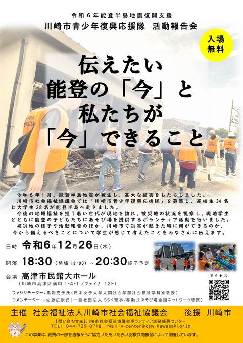 本日(12月26日18時半~)、今年夏に能登でボランティア活動を行った学生による活動報告会を開催学生が被災地に行き、現地の方との交流を通じ何を感じ、どう考えたか。被災地や今後の防災についても参考になり..