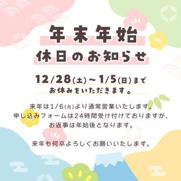 年末年始休業のお知らせ2024年12月28日(土)~2025年1月5日(日)まで1月6日(月)より通常営業となります。申込フォームは24時間受け付けておりますが、ご返信は年始後となります。来年も何卒よ..