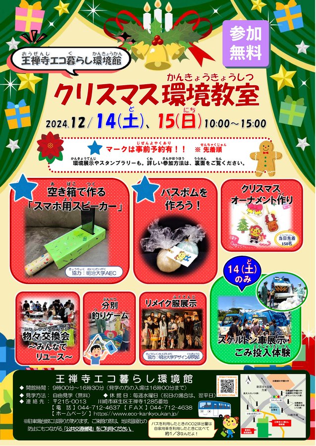 #王禅寺エコ暮らし環境館では、12月14日(土)・15日(日)に#クリスマス環境教室を開催します!リサイクル品を使ったクリスマスオーナメント作りや分別釣りゲームなど楽しいイベントが盛りだくさん14日に..