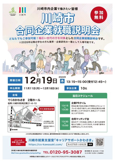 【参加者募集】どなたでも参加可能川崎市内の企業等10社が参加予定の「川崎市合同企業#就職説明会」を12月19日(木)に開催!(#無料・事前予約制・#先着順)幅広い世代の方を対象としているので、お気軽に..