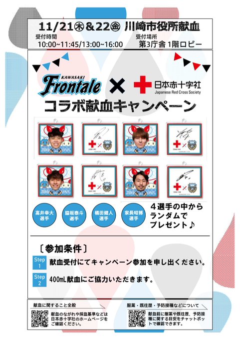 #川崎フロンターレ×#赤十字コラボキーホルダー(非売品)を#献血ご協力者にプレゼント!11月21日(木)、22日(金)に#川崎市役所で献血をして、選手のキーホルダーをゲットしよう!詳細↓https:/..