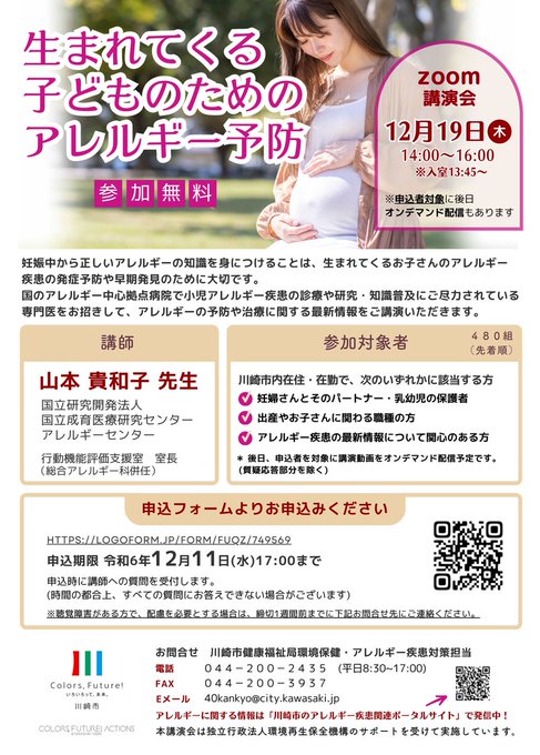 妊娠中から#アレルギーの正しい知識を身につけましょう!生まれてくるお子さんのためのアレルギーの予防や治療に関する最新情報について、専門医による#オンライン講演会を開催します12月19日(木)14:00..