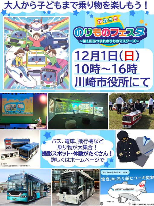 大人から子どもまで乗り物を楽しもうかわさきのりものフェスタ~第1回あつまれのりものマスターズ~12月1日(日)10:00~16:00川崎市役所本庁舎VR運転手体験おんがくえほんコンサート自動運転バス車..
