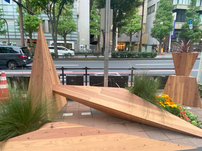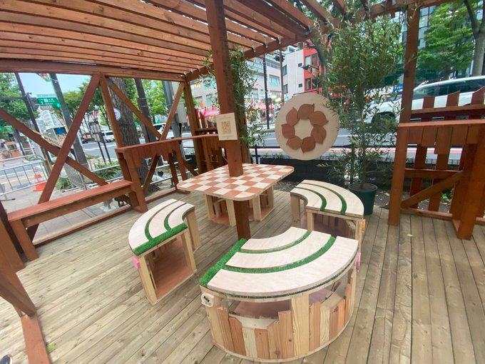 座って休めるパークレット#15鉄の床の上にきのこみたいな椅子と机柔らかさもあり、硬さもあり板面を見てみてね・設計デザインスタジオ•クハラ•ヤギ・製作、材料(木部)銘建工業(株)・製作、材料(鉄部)日崎..