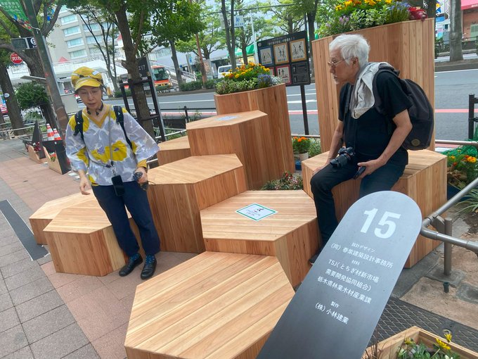 どこに座りたい?#14栃木の木をいっぱい触ってもらいたくて、このデザインを思いついたんだ。ただ座ってるだけじゃなくて、本を読んだり、友達とおしゃべりしたり。そんな感じで使える場所を作りたかったんだよね..