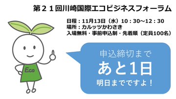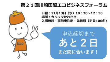 明日11日が申込〆切です11月13日(水)開催の#第21回川崎国際エコビジネスフォーラムの来場参加者を募集中参加費無料事前申込制、先着順(定員100名)申込は、下記サイトから●申込サイトhttps:/..