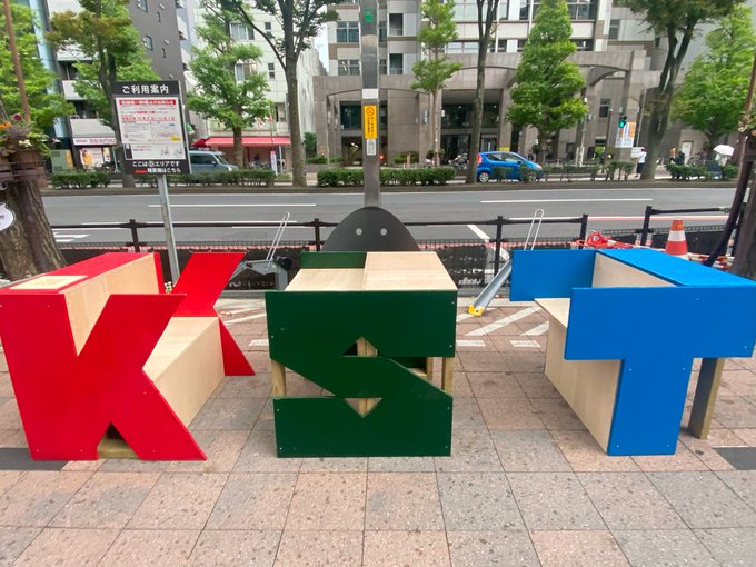 校章・KSTベンチテーブル#10#川崎総合科学高校PRのため校章の形と、略称のKSTの文字形をした机・椅子を緑化の観点で作成しました。・設計デザイン・製作川崎市立川崎総合科学高等学校・施工ジェクト(株..