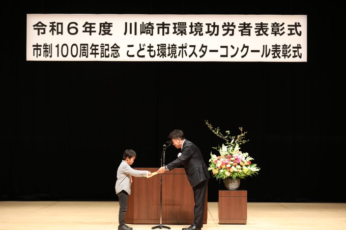 #市制100周年記念事業こども環境ポスターコンクールの表彰式を11月7日に実施!福田市長から各部門の金賞受賞者に賞状授与を行い、皆さん堂々と受け取られていました。更にイベントで大人気の#かわるんぬいぐ..