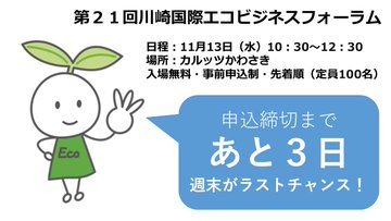 11月13日開催の#第21回川崎国際エコビジネスフォーラムいよいよ来週です。登壇者の確定及び追加登壇者のお知らせです。当日の来場には事前申込が必要です(先着順、入場無料)。続々お申込み頂いていますので..