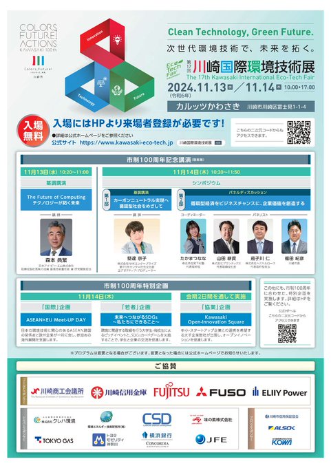 第17回#川崎国際環境技術展が、11/13(水)、14(木)に、#カルッツかわさきで開催。#市制100周年の今年は、「CleanTechnology,GreenFuture.次世代環境技術で、未来を拓..