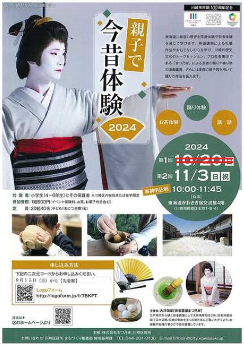 『親子で今昔体験2024』日本で唯一の女形芸者#まつ乃家栄太朗さんが芸者体験を通じて川崎の歴史を伝えます芸者踊りや演奏観賞、礼儀作法やおもてなしの心日本の文化を学びましょう。11月3日(日・祝)10:..