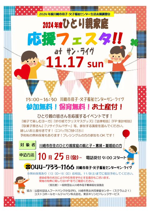 ひとり親家庭応援フェスタ!!atサン・ライヴ親子で楽しめるコーナーや法律・家計相談など#ひとり親家庭の皆さんを応援する年に一度のイベントです11月17日(日)13:00~16:30#川崎市内在住の親子..