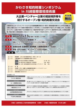 かわさき知的財産シンポジウムを11月13日(水)に開催します(#無料)#知的財産を媒介にした中小企業と大企業の新たなビジネス関係の構築を図る交流事業です。【申込締切】11月11日(月)17時まで大企業..