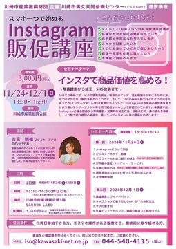 【参加者募集】\スマホ一つで始める#Instagram販促講座/商品やサービスの価値を高める#SNS発信方法を学んでみませんか?【日時】11月24日(日)・12月1日(日)【申込期限】11月11日(月..