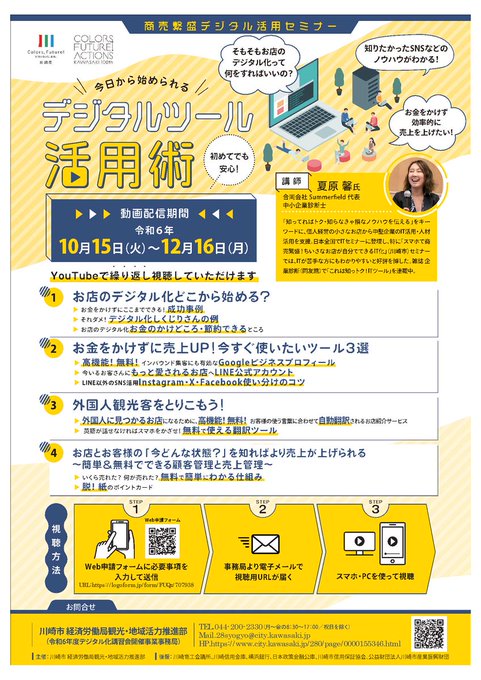 \#無料!何度でも!/動画で学べる商売繁盛!デジタル活用セミナー○お店の#デジタル化、何をすれば良い○お金をかけず効率的に売上を上げたい○外国人#観光客をとりこみたいまずは一歩踏み出してみませんか?1..