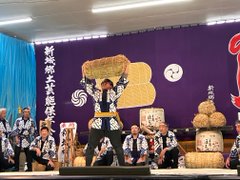 #市重要習俗技芸(指定文化財)の#新城の囃子曲持は、55kgの祝俵を持ち上げたり、25kgの曲俵を脚立や箱などの道具を用いて投げ合ったりと、力強い演目が特徴です。最後に行う「腹餅」は、なんと曲持力士の..