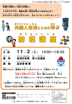 外国人市民とともに学ぶ防犯講座ドロボウやサギ、事故を防ぐ方法を高津警察署の警察官から学んでみませんか?11/2(土)14:00~16:00【場所】高津市民館第6会議室【参加できる人】外国人市民の方15..