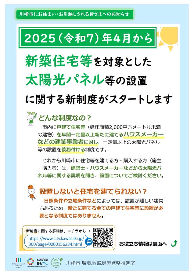 市内に住宅等を建てる方・購入する方は要チェックです令和7年4月から太陽光パネル等の設置に関する制度が始まります詳しくは、チラシ・二次元バーコードを見てね裏面には太陽光パネルに関するお役立ち情報なども掲..