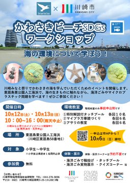 川崎みなと祭り『かわさきビーチSDGsワークショップ』のご案内海の生物や環境問題を楽しく学べるよ■日時:10/12(土),10/13(日)10時~16時■場所:東扇島東公園会場■費用:無料環境教室のみ..