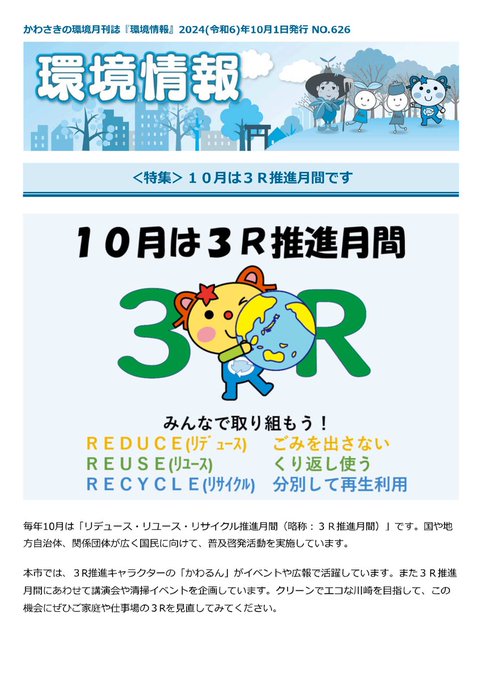 #環境情報626号を発行します!今月は3R推進月間の特集記事を掲載します。家庭や職場での3Rについて考えるきっかけにしてみてください!夢見ヶ崎動物公園でのイベントや環境セミナーなど、盛りだくさんの情報..