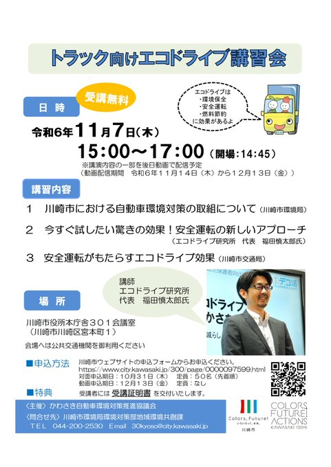 運転に役立つスキルやエコドライブの効果を学び、エコドライブの推進役となるための講習会を開催します開催日時対面実施:11月7日(木)15時~17時動画配信:11月14日(木)~12月13日(金)詳細は市..