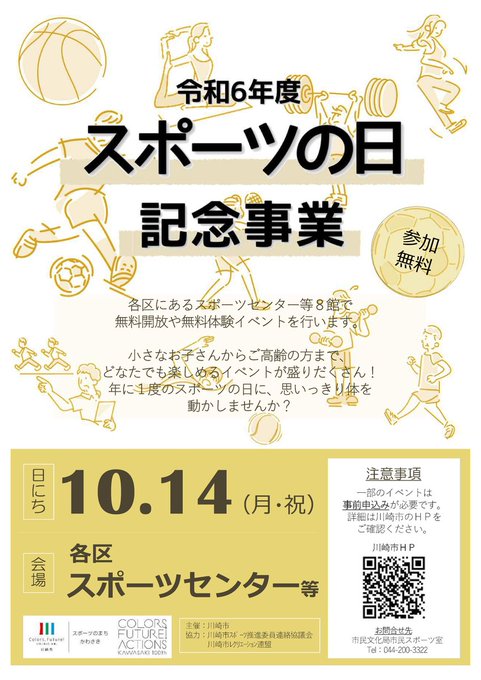 年に一度の#スポーツの日体を動かしてみませんか♪10月14日(月・祝)#とどろきアリーナなど#川崎市の各区#スポーツセンターにて無料開放や無料体験イベントを行います一部事前申込みが必要なイベントも詳細..