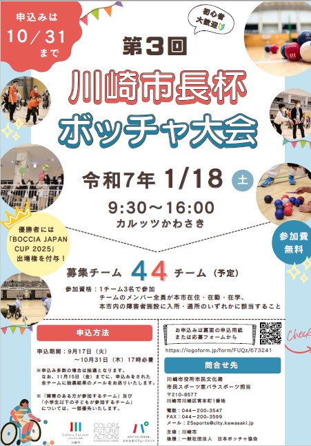 『第3回川崎市長杯ボッチャ大会』出場チーム募集中#パラスポーツ#初心者歓迎障害や年齢を問わず誰もが楽しめる#ボッチャ大会出場してみませんか※チームメンバー全員が川崎市に在住・在勤・在学、市内の障害者施..