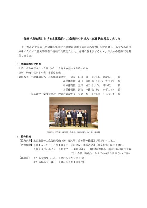 【報道発表】上下水道局で実施した令和6年能登半島地震の水道施設の応急復旧活動に対し、多大なる御協力をいただいた協力事業者の皆様の功績をたたえ、感謝の意を表するため、市長から感謝状を贈呈しました。htt..