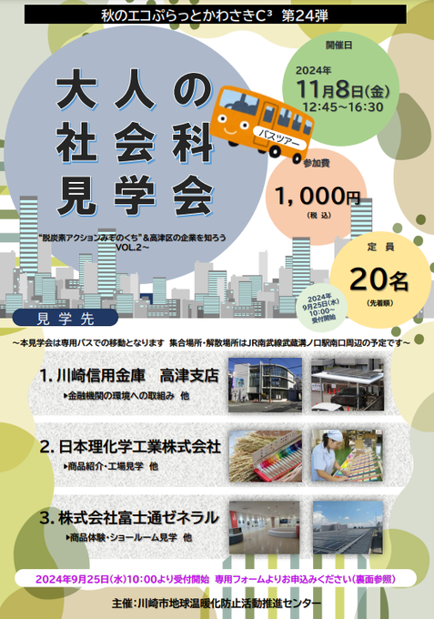 大人の社会科見学会11/8(金)12:45~16:30川崎信用金庫高津支店金融機関の環境への取組み他日本理化学工業株式会社商品紹介・工場見学他株式会社富士通ゼネラル商品体験・ショールーム見学他先着20..