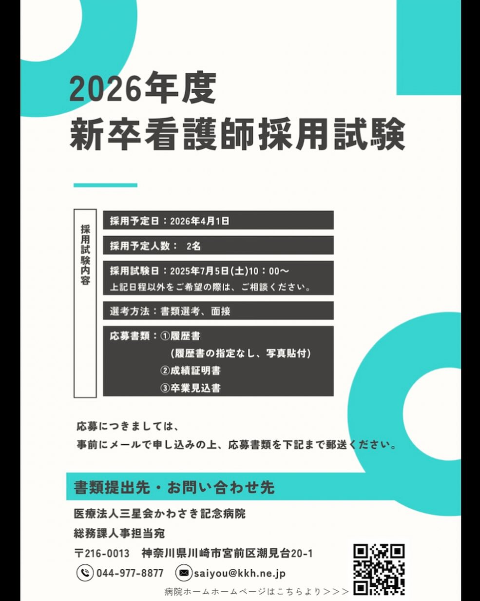 2026年度新卒看護師採用試験のご案内です!かわさき記念病院では、2026年度の新卒看護師を募集しておりま..