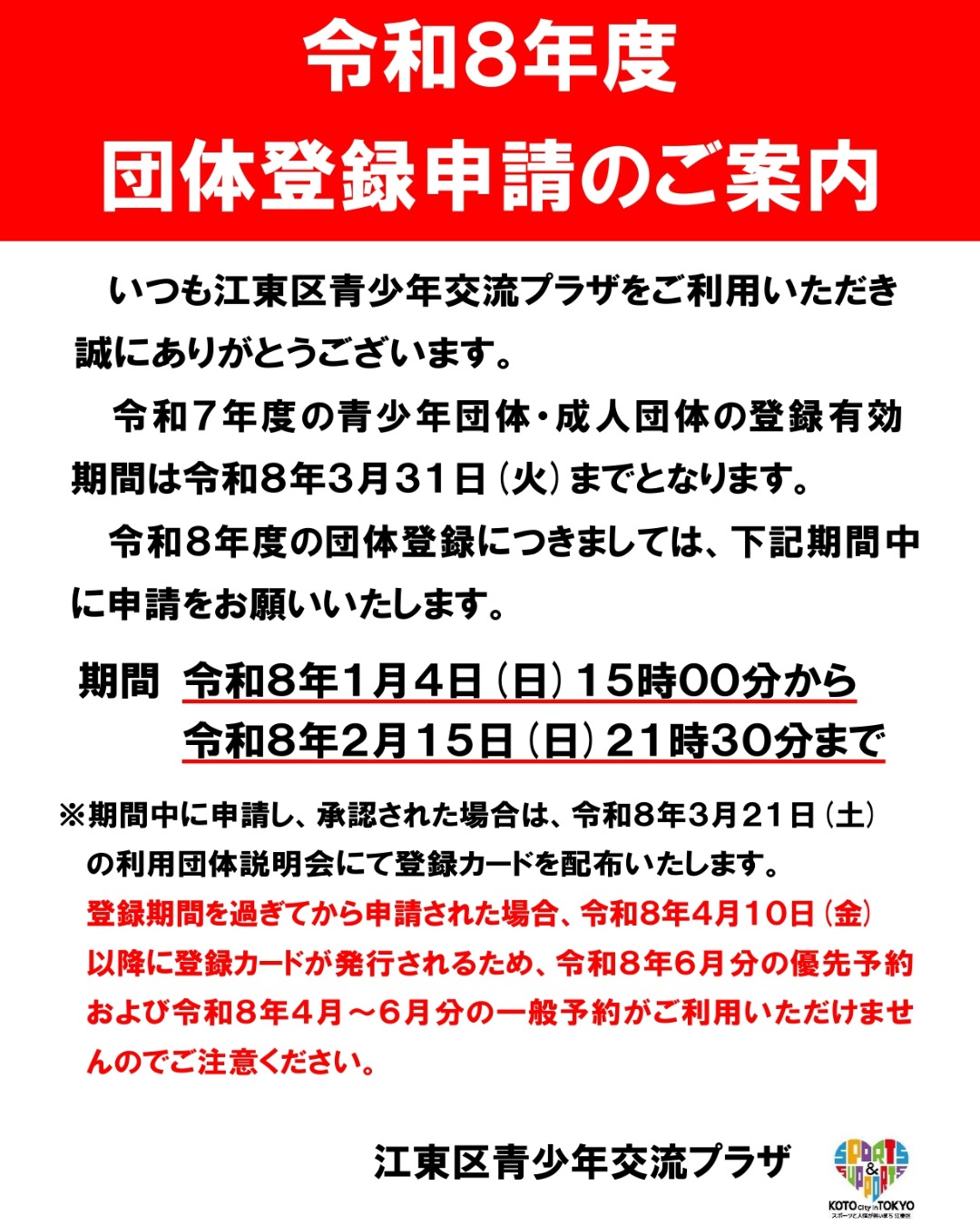 いつも江東区青少年交流プラザをご利用いただき誠にありがとうございます。令和7年度の青少年団体・成人団体の登録有効期間は令和8年3月31日までとなります。令和8年度の団体登録につきましては、下記期間中に..