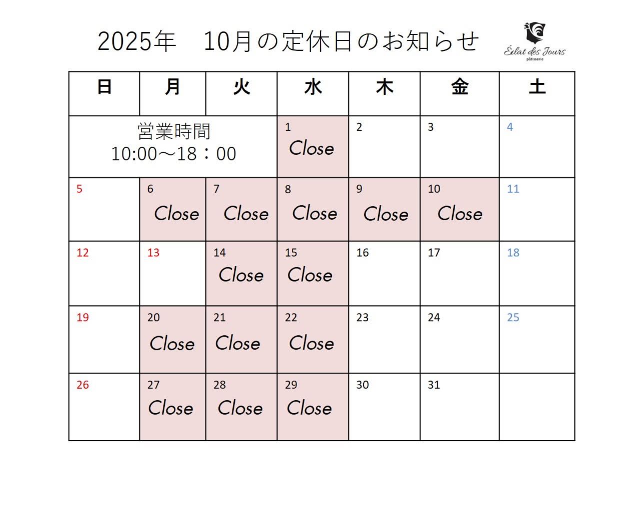 :お知らせ:東陽町本店、10月の定休日です。6日(月)から10日(金)まで、少し遅めの夏季休暇を頂きます。お客様には大変ご不便をお掛け致しますが、ご理解の程、何卒宜しくお願い致します。8日、9日、10..