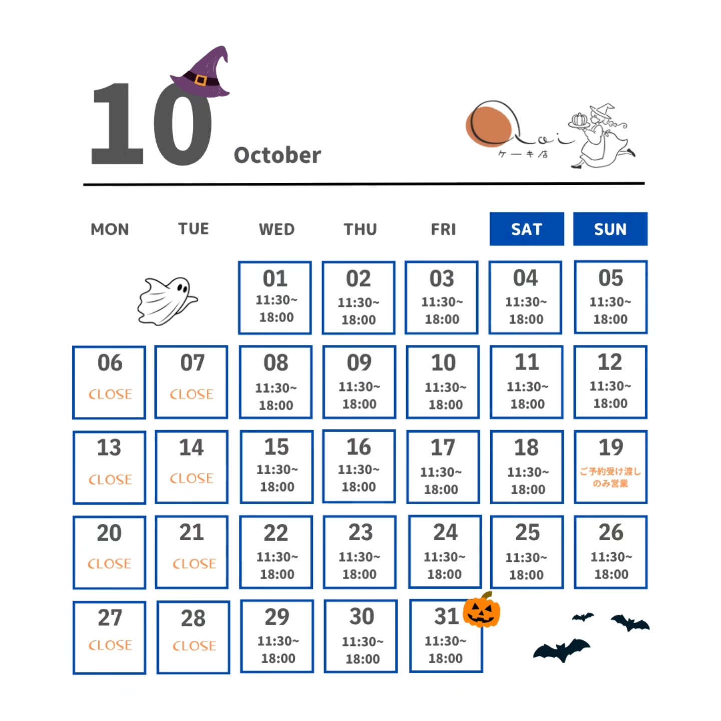 【Hello October!】10月のスケジュールですご確認下さいませ。月曜定休に加えて今月は火曜日も合わせてお休みです。19日日曜日はご予約さまお受渡しのみ営業。仕込みの都合によりスケジュール変更..