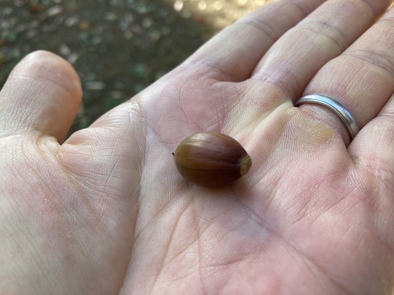 【どんぐりの木「マテバシイ」】ブナ科マテバシイ属の日本固有の常緑広葉樹。房総半島から沖縄の広範囲の海地に見られます。ドングリは直径2~3センチで細長くヤジロベイやコマなどの玩具作りに適します。クリに似..