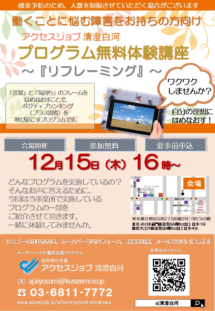 おはようございます❕東京は晴れです☀️今日は『プログラム無料体験講座:リフレーミング』があります!利用者様から「楽しかった」と感想をいただくことが多い、人気の講座です😊本日も一日頑張っていきましょう✨..