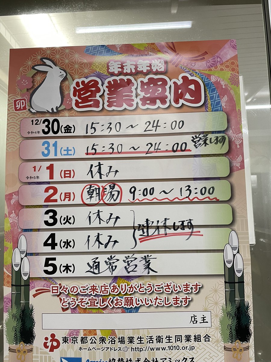 3時半より営業中♨️毎週土曜日定休を頂いていますが12月31日土曜日は営業します♨️大晦日に銭湯♨️で今年の垢を流して新年をお迎えできるように‼️本日は24時迄営業中無料駐車場二台完備🚘0318