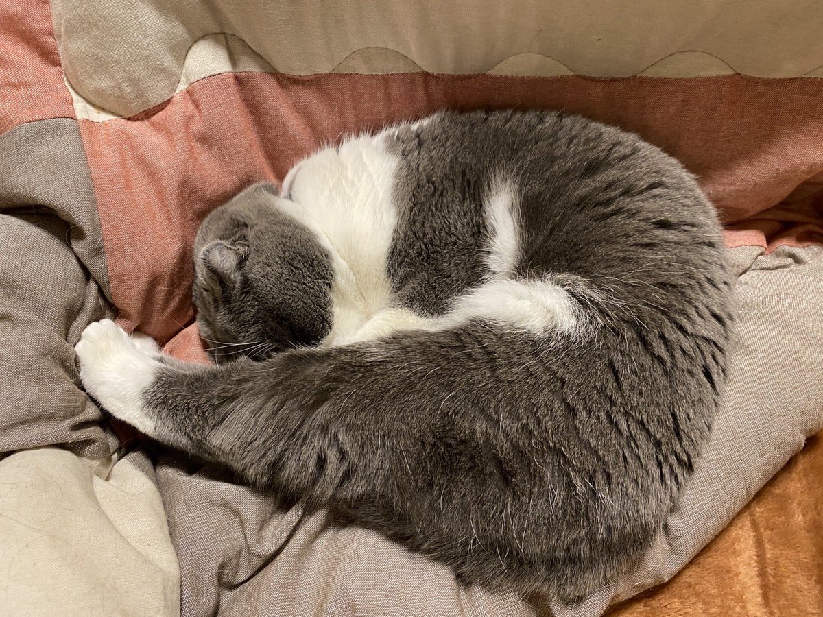 今日、あまりの寒さ! 番台猫🐱リンちゃん こたつで丸まっています 足を伸ばしてます‼️ 丸と言うよりは ひらがなの「つ」 店を閉めて、こたつに入ると 起きます‼️ おかえりなさい!!ママ